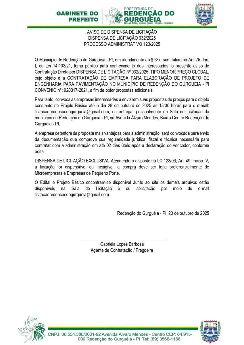 AVISO DE DISPENSA DE LICITAÇÃO N° 032/2025