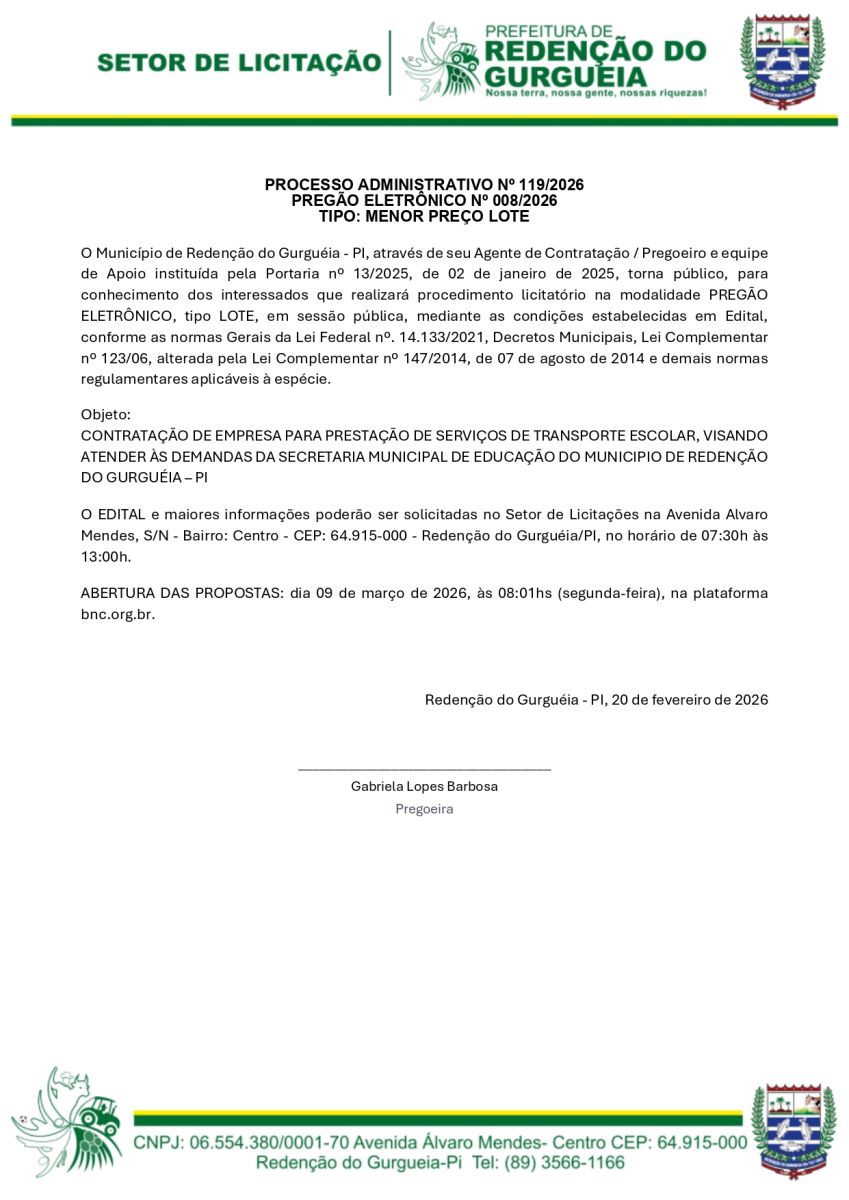 AVISO DE PREGÃO ELETRÔNICO Nº 008/2026